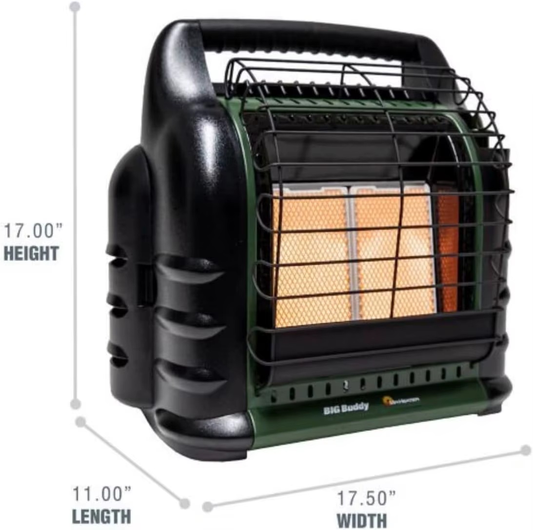 The Green Big Buddy Portable Liquid Propane Heater delivers powerful, adjustable heat from 4,000 to 18,000 BTU, making it ideal for both indoor and outdoor use. Weighing only 15 pounds, this compact and portable heater is perfect for camping, workshops, patios, garages, and emergency home heating.