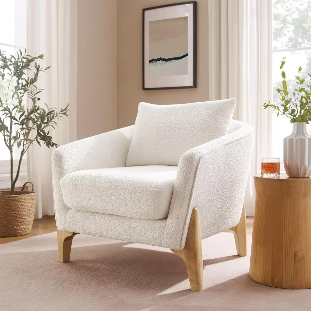 Add a touch of modern elegance and cozy comfort to your home with this Modern Cushioned Armchair. Designed with soft boucle fabric and sturdy wooden legs, this accent chair blends seamlessly into living rooms, bedrooms, and home offices, offering a perfect balance of style and function.