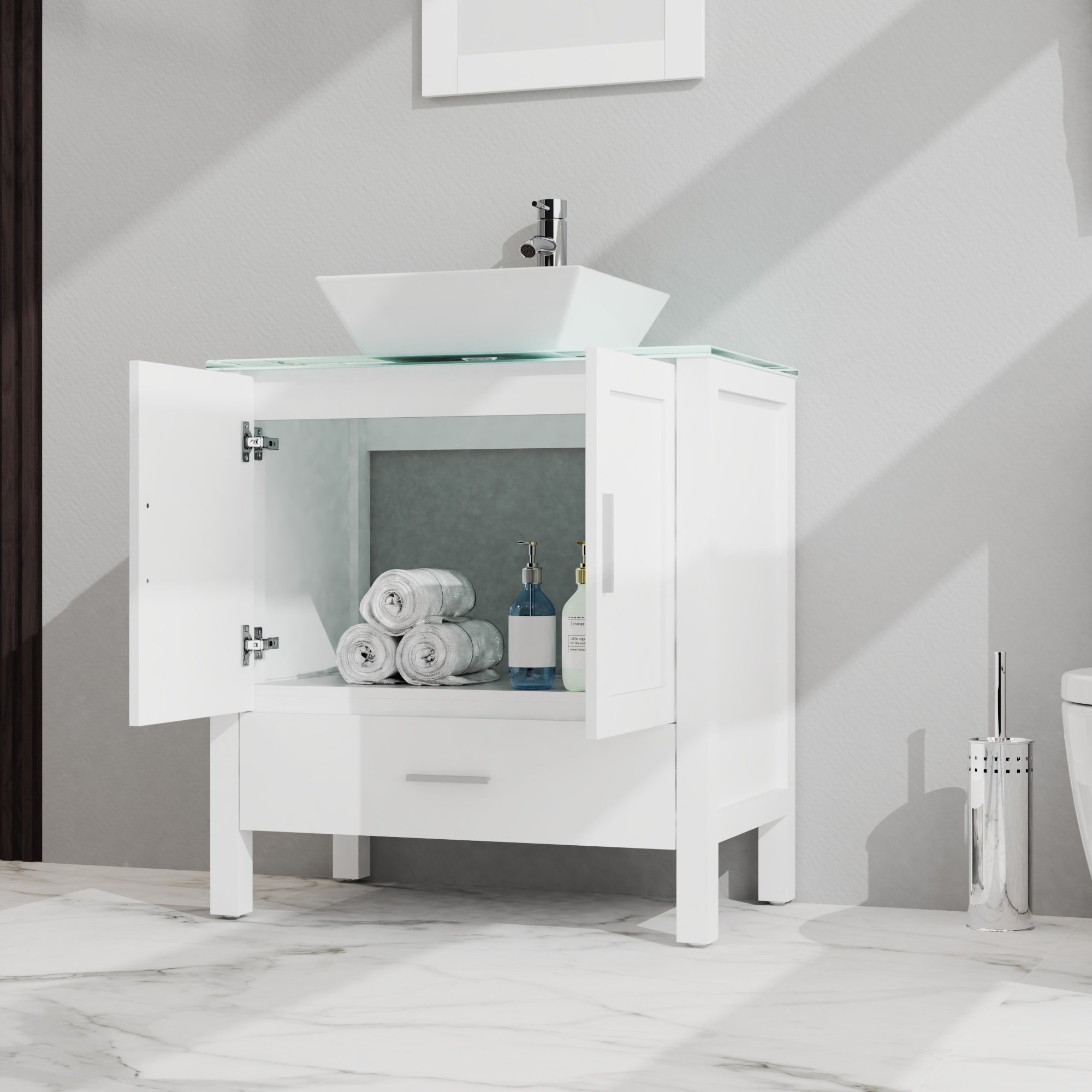 Goodyo 30" Bathroom Vanity & Sink Combo - Glass Top Cabinet with Mirror | White | Modern Freestanding Design