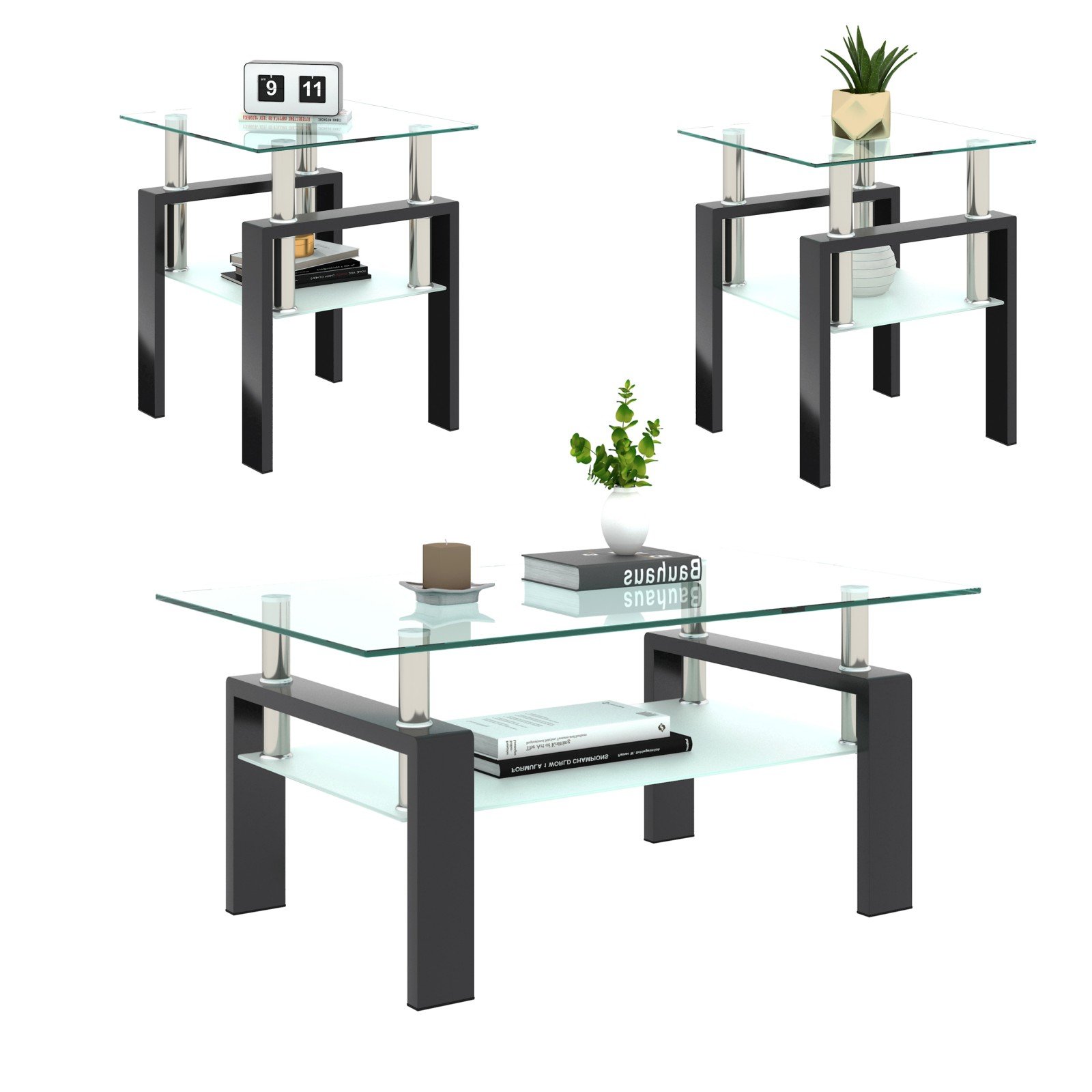 Set of 2 Modern Tempered Glass Coffee Tables | Square End Tables for Living Room | Transparent & Black Design