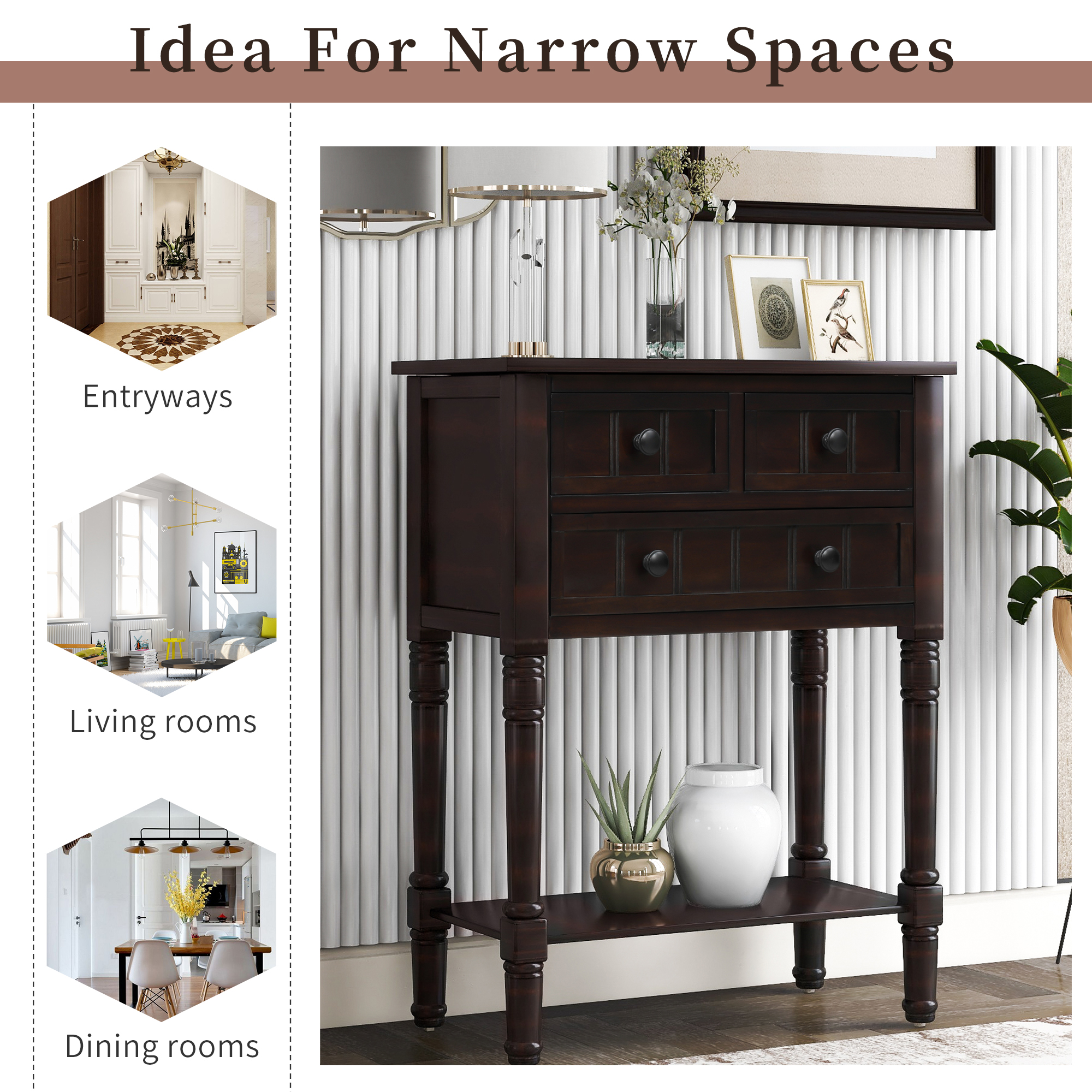 Maximize your hallway or living room with this elegant and functional narrow console table. Crafted from solid wood and finished in rich espresso, it features three storage drawers and a bottom shelf, perfect for organizing essentials in style.